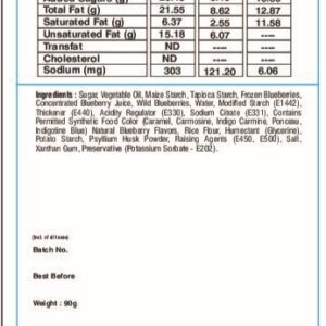 Sugar, Vegetable Oil, Maize Starch, Frozen Blueberries, Concentrated Blueberry Juice, Wild Blueberries, Water, Modified Starch, Sodium Citrate, Contains Permitted Synthetic Food Colour, Natural Blueberry Flavours), Rice Flour, Water, Glycerine, Potato Starch, Salt, Xanthan Gum, Potassium Sorbate.